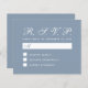 Un presupuesto simple y minimalista para un boda. Sólo tiene texto blanco sobre fondo azul polvoriento. El título RSVP y la letra M están escritos en un guión caligráfico elegante, el resto en mayúsculas.