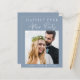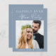 Boda privado azul y apto para el presupuesto o invitación de fugas y recepción o celebración de fiesta invitación. La parte frontal muestra tu foto y "Feliz eterno después del Fiesta" en una mezcla de simple tipografía blanca y un guión blanco moderno de moda. Debajo de la foto, agregue sus nombres y fecha de boda. En la parte posterior, personaliza el mensaje y los detalles de la recepción, ingresa la dirección del sitio web del boda para crear un código QR para que los huéspedes puedan buscar más información y a RSVP en línea, y agrega los nombres en un guión blanco característico de la firma.