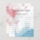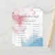 Elegante carta de juego de fiesta con salpicaduras de color de agua en rosa y azul con falso purpurina de oro. Juego perfecto para jugar durante la ducha. En él se enumeran los productos básicos para bebés y se pide a los clientes que adivinen el precio. ¡Quien adivine el precio gana más cerca!