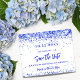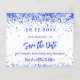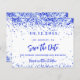 Un fondo blanco moda decorado con un confeti azul real. Personalice y agregue una fecha y un nombre/edad. El texto: Save the Date se escribe con un gran guión de estilo escrito a mano. Texto azul real. 1 hoja = 1 Guardar el borde impreso de fecha en borde.