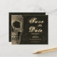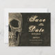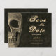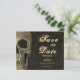 Gótica media calavera vintage sepia presupuesto Guardar la invitación de tarjeta plana de fecha. Fun, espeluznante Halloween hasta la muerte nos hace Parte del guión sobre el fondo de la impresión de texturas en la parte trasera. Derechos de imagen de Marg Seregelyi Photography.