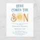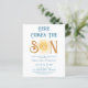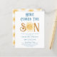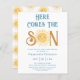 Invite a su familia y amigos a su ducha de natación con temática solar con esta invitación a los niños de bajo presupuesto para una ducha de bebé. Presenta el texto "Here Comes The Son" en tipografía retro azul con un bonito sol acuarela amarillo. La parte trasera está decorada con un patrón de sol sonriente. Personalizable fácil. Acuarela original © Michele Davies.