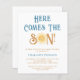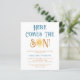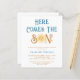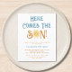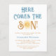 Invite a su familia y amigos a su ducha de bebé con temática solar con esta invitación a la ducha de bebé para niños de bajo presupuesto. Presenta el texto "Here Comes The Son" en tipografía retro con un bonito sol acuarela amarillo. Personalizable fácil. Acuarela original © Michele Davies.
