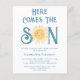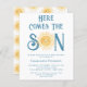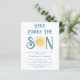 Invite a su familia y amigos a su ducha de bebé con temática solar con esta invitación a la ducha de bebé para niños de bajo presupuesto. Presenta el texto "Here Comes The Son" en tipografía retro azul con un bonito sol acuarela amarillo. La parte trasera está decorada con un patrón de sol sonriente. Personalizable fácil. Acuarela original © Michele Davies.
