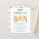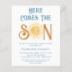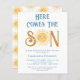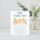 Invite a su familia y amigos a su ducha de bebé con temática solar con esta invitación a la ducha de bebé para niños de bajo presupuesto. Presenta el texto "Here Comes The Son" en tipografía retro azul con un bonito sol acuarela amarillo. La parte trasera está decorada con un patrón de sol sonriente. Personalizable fácil. Acuarela original © Michele Davies.