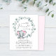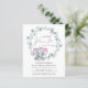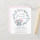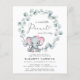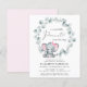 Una tierna y atractiva invitación a rociar a una bebé con presupuesto especial que incluye "A Sweet Little Peanut Is On Her Way", escrita en una mezcla de tipografía moderna y un guión elegante, y una acuarela de un elefante rosa pastel en una guirnalda de vegetación eucalipto.