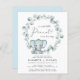 La invitación a la ducha de una pareja de niños adorable y económica con "A Sweet Little Peanut Is On Your Way", escrita en una mezcla de tipografía moderna y un guión elegante, y una acuarela de un elefante de color azul pastel en una guirnalda de vegetación eucalipto. Añada los nombres de la madre y del padre en una tipografía simple.