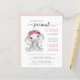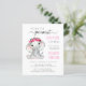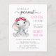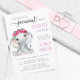 Invitación a una ducha de bebé con presupuesto reducido con "Our Sweet Little Peanut Is On Her Way" escrita en una mezcla de tipografía rosa y gris suave y un guión de bonito con toallitas, y una linda acuarela de una niña elefante con una corona floral rosa en la cabeza. Personalice los nombres del bebé y de la futura madre en tipografía rosa y los detalles de la ducha en una simple y moderna tipografía gris.