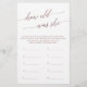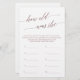 Este elegante juego de caligrafía de oro rosa "qué edad tenía" es perfecto para una simple ducha de novia. El diseño rosa oscuro incluye una tarjeta de juegos minimalista decorada con una tipografía romántica y caprichosa de imitación rosa de Relieve metalizado dorado. Personalizar el juego con el nombre de la novia. Nota: Este diseño no tiene Relieve metalizado de oro rosa real. Es un gráfico de alta calidad hecho para parecer un Relieve metalizado de oro rosa.