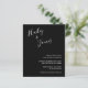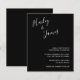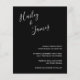 Invitación de boda económica moderna con un diseño sencillo con sus nombres en un guión manuscrito elegante en la parte superior izquierda y los detalles de su evento en alineación derecha en la parte inferior derecha. Todos los elementos de diseño están en blanco sobre un fondo negro y pueden cambiarse en la herramienta de edición de diseño. La letra a mano de moda añade un toque romántico a este diseño minimalista.