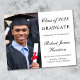 Invitación de graduación universitaria moderna y sencilla, económica, que incluye una foto del graduado, su nombre y año de clase en un guión elegante y su universidad, especialidad y honores.