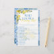 Celebra a la futura madre con un toque alegre e interactivo usando nuestro juego "Who Knows Best" (Quién conoce a la mejor mamá) de nuestro limón! Diseñado para coincidir a la perfección con la colección de Baby Shower Elegant Lemon, este juego presenta limones acuarelas vibrantes, delicados acentos florales y un interminable fondo de azulejos azules y amarillos que capta el encanto del Mediterráneo. Los huéspedes se divertirán respondiendo preguntas sobre la futura mamá, provocando risas y momentos dulces mientras prueban lo bien que la conocen. Ya sea que esté organizando un fiesta de jardín de primavera, una ducha de verano o un evento de temática italiana, este juego elegante le aporta el toque personal perfecto.