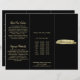 Folleto de tríplio moderno con un trazo de pintura de oro abstracto y tu nombre en un guión elegante sobre un fondo negro. El panel posterior tiene sus horas de funcionamiento e información de contacto. El panel plegable interior tiene dos cabeceras y cuadros de texto. El interior tiene varias plantillas para obtener información sobre su negocio en los paneles exteriores y una lista de precios en el panel intermedio. Ambos lados tienen guías plegables que se pueden eliminar haciendo clic en el botón "personalizar". Un sencillo folleto triplicado con un toque femenino, perfecto para una peluquería, salón de belleza o peluquería.