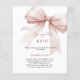 Un elegante fondo blanco, decorado con un arco de color dorado subió. Personalice y agregue un nombre y detalles del fiesta. Texto: Ella está atando el nudo. 1 hoja = 1 borde impreso de invitación al borde.