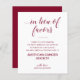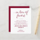 Estas encantadoras sábanas planas en blanco y burdeos "en lugar de favores" son una manera maravillosa de hacer saber a sus invitados que han hecho una donación a su organización benéfica favorita en honor a ellos en su día de bodas. Parte de la colección de Alejandra.