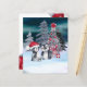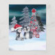Escena del árbol de Navidad del pingüino con presupuesto: una tarjeta de Navidad muy linda de Ricaso con dos pequeños pingüinos frente a un árbol de Navidad adornado con bolas rojas y una flor de poinsettia en un bosque con nieve