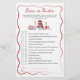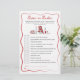¿Qué tan bien conocen sus invitados a la futura novia? Esta tarjeta de juego que es más "Over or Under" (Más o menos bajo) es una manera lúdica de probar el conocimiento de los invitados con hechos extravagantes y conjeturas divertidas. Diseñado con un fondo blanco, un guión rojo romántico y un caprichoso ilustracion italiano, combina a la perfección con la decoración de la ducha temática. Los invitados adivinan si cada declaración ha terminado o está por debajo del número real - ¡risas garantizadas!