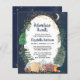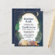 Invitación rústica y económica a la rociada de bebés con un lindo ilustracion de animales de bosque con su tienda de campaña en las montañas y el bosque, un overlay de estrellas de oro y luna en un cielo nocturno y "Adventure Awaits" y el nombre de la futura madre en un guión azul oscuro de medianoche. Personaliza fácilmente los detalles de la ducha de rociado de bebé.