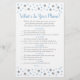 Estas elegantes tarjetas What's In Your Purse son una excelente manera de iniciar la diversión en tu Baby Shower y garantizar que sea un gran éxito. Simplemente pasarlos por el Baby Shower donde los invitados se divertirán pasando por sus teléfonos celulares y desconectando los artículos que tienen de la lista. ¡La persona con más puntos gana! El diseño presenta hermosas estrellas de color azul y plata.