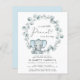 Una encantadora y económica invitación a bañarse en una ducha infantil con "A Sweet Little Peanut Is On His Way", escrita en una mezcla de tipografía moderna y un guión elegante, y una acuarela de un elefante de color azul pastel en una guirnalda de vegetación eucalipto.