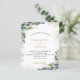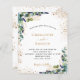 Un fondo blanco decorado con vegetación eucaliptos y follaje dorado. Personalice y agregue sus nombres y detalles del boda. Letras de color negro y dorado. Atrás: agrega tu weburl a tu sitio web boda para obtener información sobre RSVP o detalles.