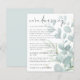 Eucalyptus Reduciendo el Boda de Livestream. Un precio económico menor 4,5" x 5,6" alternativa. Disponible en un ALMACENAMIENTO DE TARJETAS SEMI GLOSS 110 lb que es la opción predeterminada (para invitaciones), O EN UN ACCESO DE PAPEL DELGADO SATIN DE 80 lb (ideal para gabinetes). Los sobres son un extra opcional y son algo más grandes que el tamaño de la tarjeta. Si las circunstancias significan que ha sido necesario reducir el tamaño de su boda, esto invita a sus invitados a transmitir en directo su ceremonia. Este diseño tiene un eucalipto moderno teñido a la derecha y moderno guión de juego de estilo manuscrito para el encabezado principal. El resto del texto que puede personalizar fácilmente. Un azul polvoriento de coordinación está en la parte posterior
