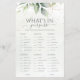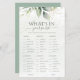 Añade un giro juguetón a la celebración de tu boda con este juego de personalizable "¿Qué hay en tu bolso?" Con un bonito diseño acuático con vegetación y acentos dorados, este juego hará que sus huéspedes se entretengan y adivinen. Personaliza el juego con tus ideas para crear un keepsake único para tu día especial. Perfecto para duchas de novias, cenas de ensayo o recepciones de bodas, este juego es una forma divertida e interactiva de celebrar con sus seres queridos.