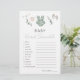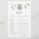 Sofisticado juego clásico de "Disputa de la palabra del bebé" diseñado para una ducha de bebé, adornado con un encantador vestido de niña, zapatos, juguete y hojas de eucalipto verde. Haga participar a sus huéspedes en este delicioso juego, perfecto para añadir diversión y emoción a su celebración mientras crea recuerdos preciados. Respuestas: 1. diaper 2. rattle 3. pacifier 4. fórmula 5. embarazo 7. stroller 8. asiento de automóvil 9. botella 10. vivero 11. bassinet 12. contracciones