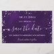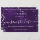 Una glamorosa tarjeta Save the Date para una fiesta de cumpleaños número 50 (o cualquier edad). Un fondo morado desigual. Decorada con polvo falso purpurina de plata. El texto: Save the Date se escribe con un gran guión de estilo escrito a mano.