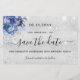 Una chica y de moda Guardar la tarjeta de fecha para una fiesta de cumpleaños número 50 (o cualquier edad). Un clásico fondo de aspecto metálico de imitación plateada decorado con un polvo falso purpurina plateado y flores azules. Personalice y agregue una fecha y un nombre/edad. El texto: Save the Date se escribe con un gran guión de estilo escrito a mano.