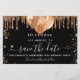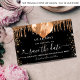 Una chica y de moda Guardar la tarjeta de fecha para una fiesta de cumpleaños número 18 (o cualquier edad). Un fondo negro clásico decorado con purpurinas y globos dorados falsos. Personalice y agregue una fecha y un nombre/edad. El texto: Save the Date se escribe con un gran guión de estilo escrito a mano.