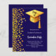 Una moderna y elegante invitación a la fiesta de graduación. Un fondo azul oscuro decorado con un falso confeti de oro y una gran gorra dorada de graduación con tassel. Personalice y agregue un nombre y detalles del fiesta. Texto blanco. 1 hoja = 1 borde impreso de invitación al borde.