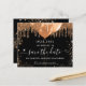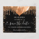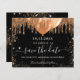Una chica y de moda Salven la tarjeta de fecha para una fiesta de 15 años en Quinceañera. Un fondo negro clásico decorado con purpurinas y globos dorados falsos. Personalice y agregue una fecha y un nombre/edad. El texto: Save the Date se escribe con un gran guión de estilo escrito a mano.