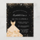 Una invitación moderna, elegante y glamurosa para una fiesta de 15 años en Quinceañera. Un fondo negro de moda con polvo falso purpurina de oro y un vestido. El nombre está escrito con una escritura de estilo con letras a mano moderna. Personalice y agregue los detalles de su fiesta.