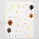 Feliz ilustracion de Halloween presentando globos fiestas en negro y naranja con un fantasma, una bruja, una telaraña y araña y una linterna en un fondo blanco.
