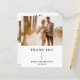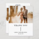 Boda de presupuesto de estilo contemporáneo y moderno tarjeta de agradecimiento con un diseño sencillo y mínimo con "Gracias" junto con sus nombres y fecha boda en tipografía en negrita debajo de su foto favorita. La parte posterior tiene una segunda imagen, su monograma inicial y su mensaje personalizado. Esta minimalista tarjeta de agradecimiento de boda tipográfico en blanco y negro se puede personalizar a cualquier color que elija en la herramienta de edición de diseño.