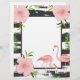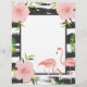 Pequeña impresión con toscos rayas blancas y negras y flamencos y flores rosadas.