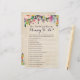 Prueba quién conoce mejor a la futura mamita con nuestro colorido juego de flor "How Well Do You Know the Mommy to Be" (Cómo sabes a la mami para ser) con un fondo vintage. Los huéspedes rellenarán los espacios en blanco para responder algunas preguntas básicas sobre la nueva madre. ¡Ganará quien sea que tenga la más correcta! No olvide visitar nuestra amplia selección de productos de baño para bebés en la colorida colección Floral de duchas para bebés.