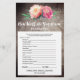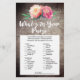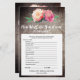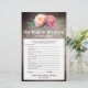Este juego de flores rústicas "cuán bien conoces a la novia" es perfecto para una ducha de novias con temática floral. La parte delantera de la tarjeta de juego incluye "qué tan bien conoces a la novia", y la parte trasera de la tarjeta muestra "qué hay en tu bolso". El diseño presenta una elegante disposición de peonías de acuarelas rosa rubor sobre un fondo de madera texturada. Personalice la parte delantera de la tarjeta con el nombre de la novia y la fecha de la ducha.