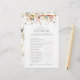 Presenta un divertido y elegante elemento en tu ducha de novia con nuestro "Floral Watercolor How Well Do You Know Shower Game" Este juego está diseñado para entretener y atraer a tus invitados, con hermosas acuarelas de arte floral combinadas con elegantes caligrafías que le dan un toque contemporáneo a las festividades. Cada tarjeta plantea una serie de preguntas sobre la novia, desafiando a los invitados a descubrir quién la conoce mejor. El diseño floral adorna con elegancia cada tarjeta, creando una estética que complementa cualquier tema moderno de la ducha de novias. Perfecto para romper el hielo y despertar la risa, este juego es una actividad imprescindible que realza la celebración y une a los invitados en honor de la futura novia. Póngase en contacto con el diseñador para obtener productos coincidentes. Ver Colección Aquí: https://www.zazzle.com/collections/119065306017130337 Copyright Anastasia Surridge, todos los derechos reservados.
