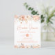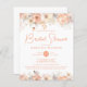 Flores beige de melocotón en las invitaciones a la ducha de novias blancas. nombres, fechas e información de personalizares.
