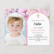 Añade tu propia foto de tamaño vertical. Marco fotográfico en forma de arco rosa. Un color de fondo blanco. Decorada con flores rosas y una cruz dorada. Personalice y agregue un nombre y detalles. 1 hoja = 1 borde impreso de invitación al borde.