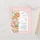 PRESUPUESTO Protea tropical flores pampas pasto y eucalipto deja una invitación de boda suave en arco rosa con código QR. Este diseño de boda bonito muestra un marco de arco sobre fondo de color rosa oscuro con sus iniciales y texto. A la izquierda hay flores de protea, pampas, hojas de palmera y eucalipto. La parte posterior incluye su código QR para RSVP.