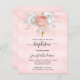 Por un bautismo elegante, celebrando a una niña. Fondo de aspecto metálico con gradiente rosado. Decorada con rosas de oro y flores blancas, rosas y una falsa cruz de oro. Personalice y agregue el nombre del niño y los detalles.