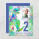 Para el niño que cumple dos años y que ama los dinosaurios. Este Roaring T Rex invita a los fans de Dino a un divertido fiesta de 2º cumpleaños. Personalice esta colorida invitación a los 2 años de color azul y verde con una foto del niño de cumpleaños, el número de cumpleaños y los detalles del fiesta y todos se preparan para un divertido cumpleaños de dinosaurios con temática de dino. Todas las especies de dinosaurios son bienvenidas. Bonita obra de arte original de la artista Catherine Sweetman
