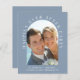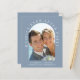 invitación de elopement azul polvoriento amigable con el presupuesto de la moda e invitación a la recepción. La parte frontal muestra la foto de su boda en un marco de arco y "Feliz siempre después del Fiesta" en una elegante tipografía blanca. Bajo la foto, agregue sus nombres, fecha de boda y ubicación. En el reverso, personaliza tu invitación e invitación, agrega tus nombres en un guión tipo firma e ingresa la dirección de tu sitio web boda para crear un código QR escaneado para que tus invitados puedan escanear en línea a RSVP y obtener detalles adicionales.