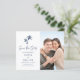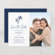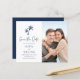 Este elegante presupuesto de bodas de playa tropical azul marino para guardar la tarjeta de fecha incluye dos palmeras encima del texto, un elegante guión de escritura a mano para la invitación "Save the Date" y una foto de la feliz pareja.