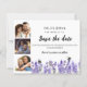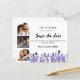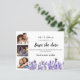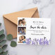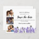 Decorada con flores de lavanda de color agua. A Guardar la tarjeta de fecha para su boda. El texto: Save the Date se escribe con un gran guión de estilo escrito a mano. Personalice y agregue 3 fotos. 1 hoja = 1 Guardar el borde impreso de fecha en borde.