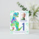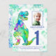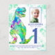 Para el niño que está cumpliendo un año y ama los dinosaurios. Este T-Rex rugiente invita a los fanáticos de los dinosaurios a una divertida fiesta de cumpleaños número 1. Invitación económica. Personalice esta colorida invitación de cumpleaños número uno con salpicaduras de acuarela azul y verde con una foto del cumpleañero, el número del cumpleaños y los detalles de la fiesta y estará listo para una divertida fiesta de cumpleaños temática de dinosaurios. Todas las especies de dinosaurios son bienvenidas. Arte original y hermoso de la artista Catherine Sweetman.