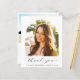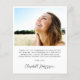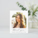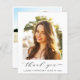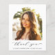 Tarjeta de agradecimiento para graduaciones amigables con el presupuesto que incluye la foto del graduado en un marco de imagen arqueada moderno, "gracias" en un guión elegante y su nombre y año de clase en tipografía simple. Al revés, puede personalizar un mensaje de agradecimiento y agregar su nombre en un script tipo firma.